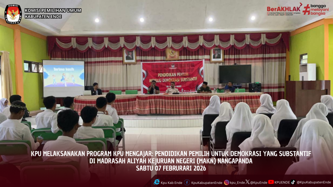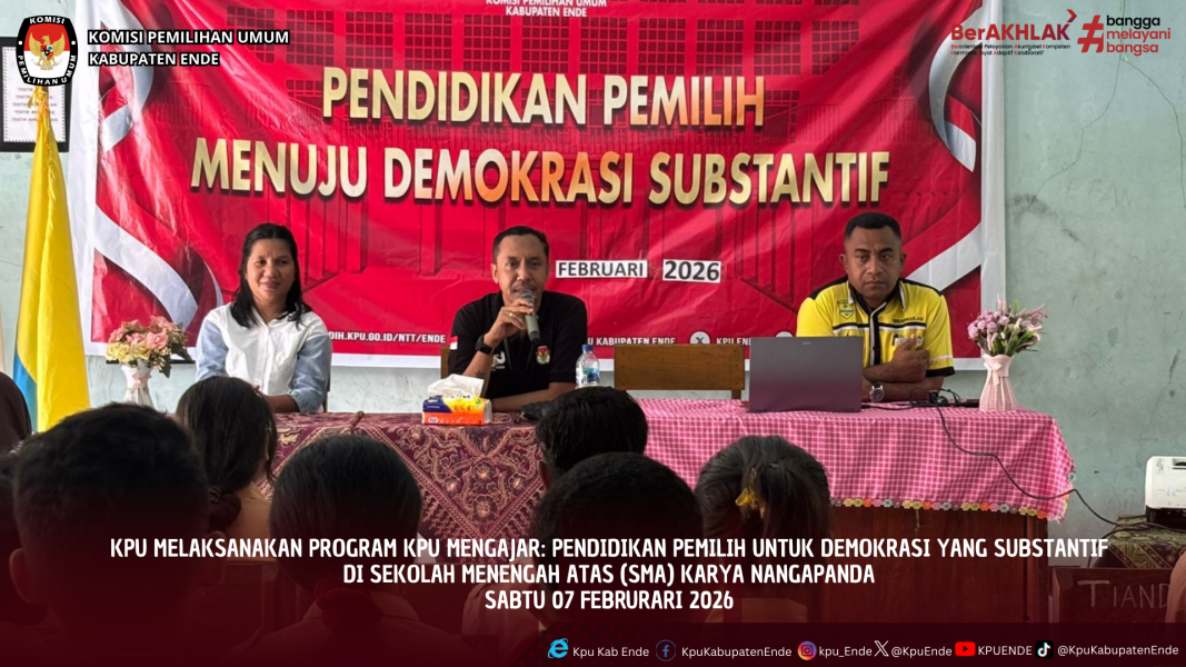 Sebagai upaya meningkatkan literasi kepemiluan pemilih pemula, Komisi Pemilihan Umum (KPU) Kabupaten Ende melaksanakan program KPU Mengajar di Sekolah Menengah Kejuran SMA Karya Nangapanda, kabupaten Ende. Kegiatan ini menghadirkan narasumber Ketua KPU dan anggota KPU Divisi Hukum.dan Pengawasan, Maria Rosita De,'so yang memberikan materi terkait pemilih pemula, peran generasi muda, serta pentingnya membangun demokrasi yang substantif melalui partisipasi aktif dan bertanggung jawab. Kedua narasumber menekankan pentingnya menjadi pemilih cerdas serta mengajak para siswa untuk menggunakan hak pilih secara bijak dan menolak praktik-praktik yang merusak demokrasi. Kegiatan berlangsung interaktif dan dilanjutkan dengan sesi tanya jawab. Para siswa tampak antusias mengikuti seluruh rangkaian kegiatan. Melalui program ini, KPU Kabupaten Ende berharap pemilih pemula semakin memahami hak dan kewajibannya serta siap berperan aktif dalam mewujudkan pemilu yang berintegritas. ....