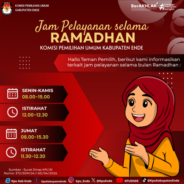 Halo #TemanPemilih Selama bulan suci Ramadhan, pelayanan di KPU Kabupaten Ende tetap berjalan dengan penyesuaian jam operasional sebagai berikut: ???? Senin – Kamis ⏰ 08.00 – 15.00 WITA ???? Istirahat 12.00 – 12.30 WITA ???? Jumat ⏰ 08.00 – 15.30 WITA ???? Istirahat 11.30 – 12.30 WITA Yuk, tetap perhatikan jam pelayanan sebelum berkunjung ya ???? Terima kasih atas partisipasi dan dukungan #KPUMelayani #kpukabupatenende ....