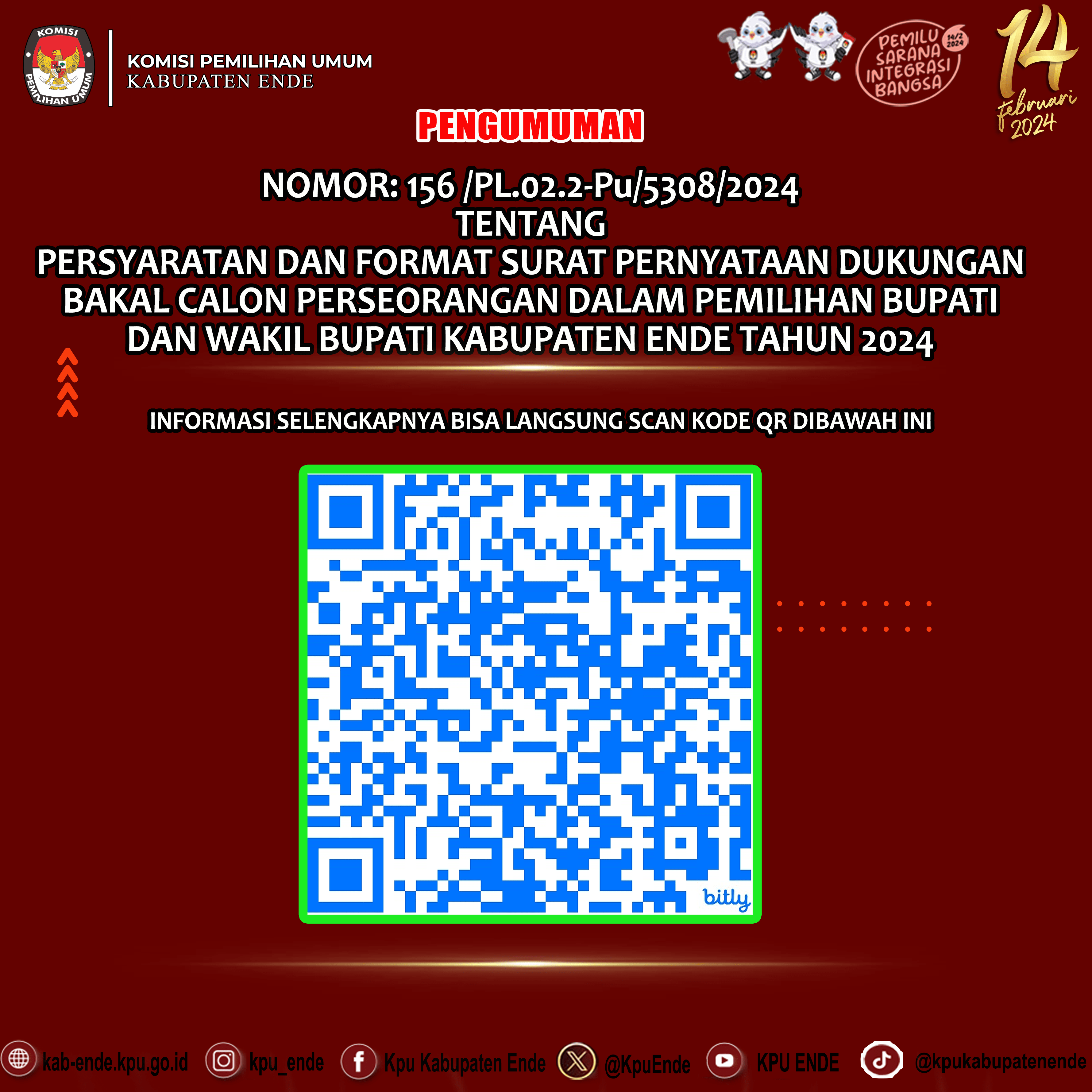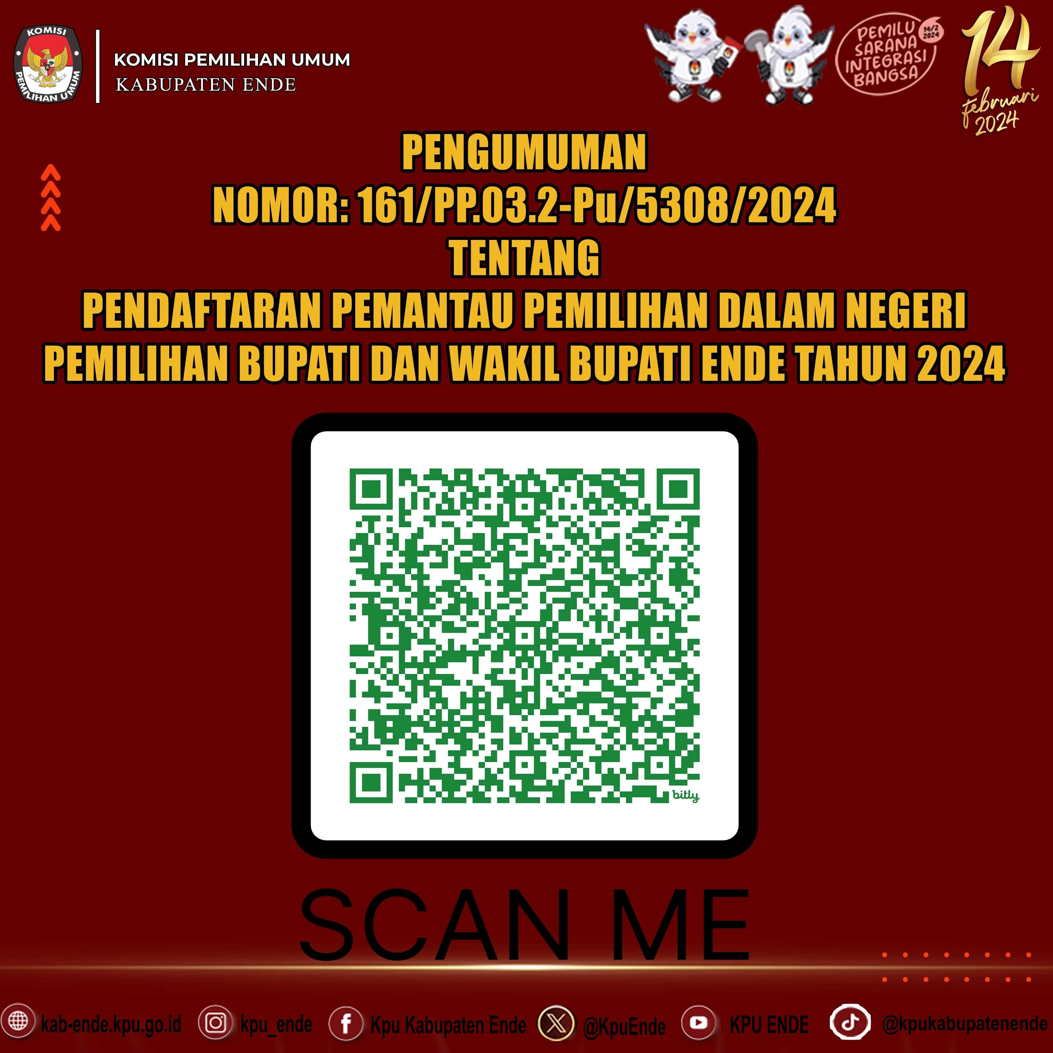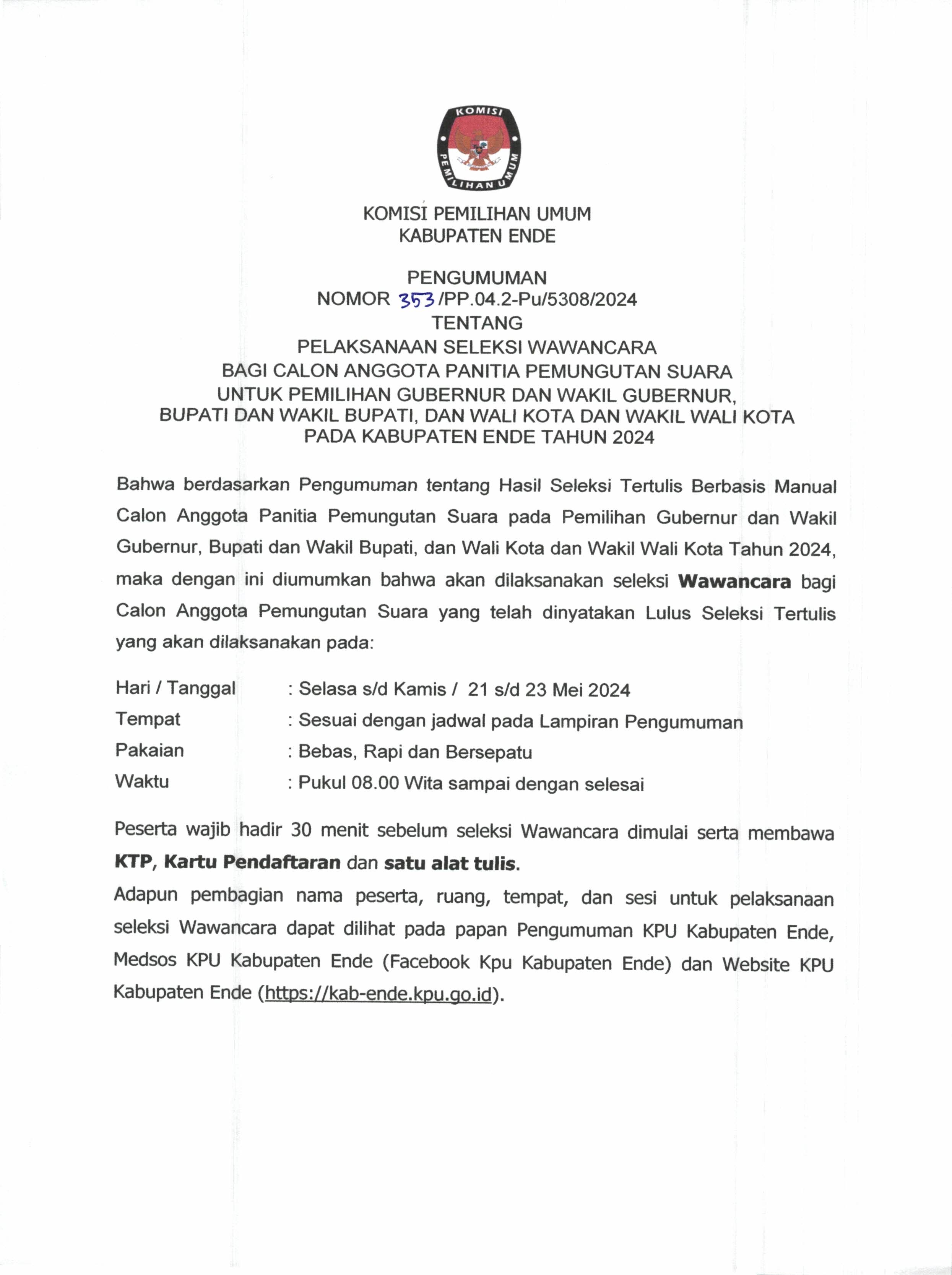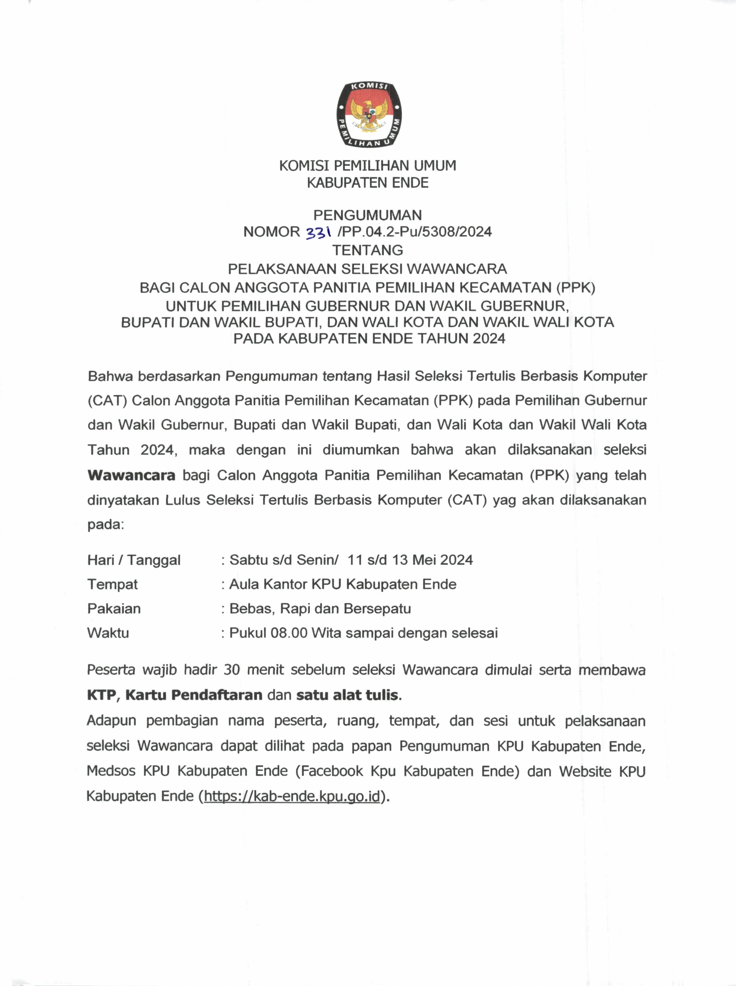 #TemanPemilih, berikut disampaikan Pengumuman Nomor: 331/PP.04.2-Pu/5308/2024 Tentang Pelaksanaan Seleksi Wawancara Bagi Calon Anggota Panitia Pemilihan Kecamatan (PPK) untuk Pemilihan Gubernur dan Wakil Gubernur, Bupati dan Wakil Bupati, dan Wali Kota dan Wakil Wali Kota pada Kabupaten Ende Tahun 2024.