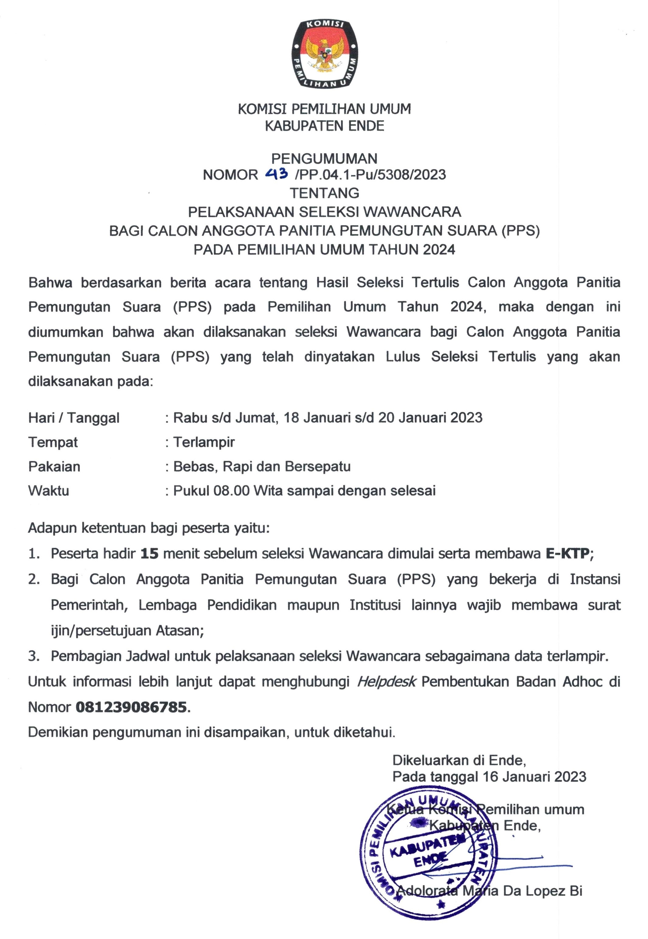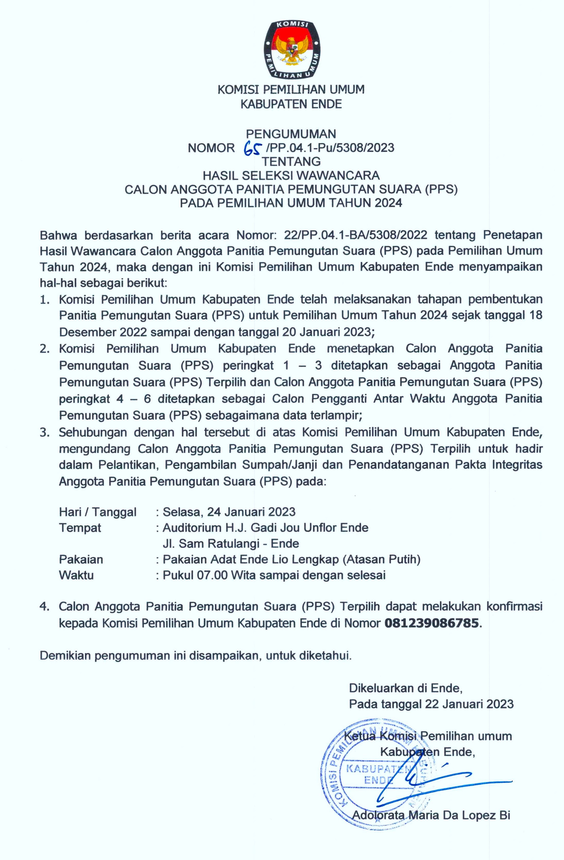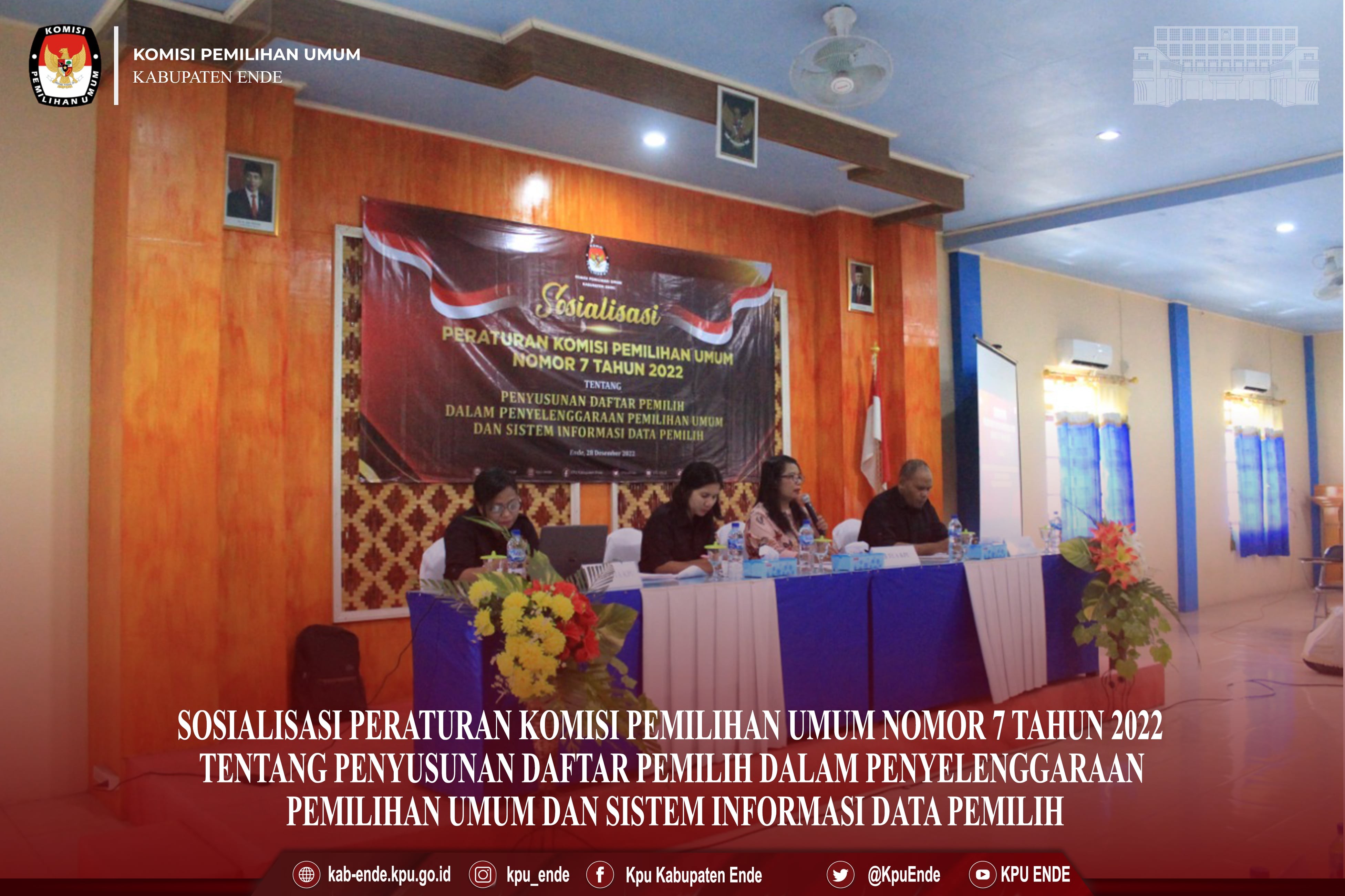 #TemanPemilih Rabu (28/12/2022) bertempat di Aula Rumah Bina Kerahiman Ilahi, Komisi Pemilihan Umum Kabupaten Ende melaksanakan kegiatan sosialisasi Peraturan Komisi Pemilihan Umum Nomor 7 Tahun 2022 tentang Penyusunan Daftar Pemilih Dalam Penyelenggaraan Pemilihan Umum dan Sistem Informasi Data Pemilih. Kegiatan dibuka oleh Ketua KPU Kabupaten Ende, Adolorata Maria Da Lopez Bi. Turut hadir dalam kegiatan ini, Anggota KPU Kabupaten Ende Ketua Divisi Teknis Penyelenggaraan Fransiskus Lothar Piara, Anggota KPU Kabupaten Ende Ketua Divisi Hukum dan Pengawasan Maria Rosita De'so dan jajaran sekretariat Komisi Pemilihan Umum Kabupaten Ende. Peserta yang diundang dalam kegiatan ini adalah Bawaslu, Kapolres, Dandim, Kepala Dinas Kependudukan dan Pencatatan Sipil, Kepala Badan Kesbangpolda, Kepala Bagian Tata Pemerintahan Setda Ende, para camat se-Kabupaten Ende, para Lurah dalam wilayah Kecamatan dalam kota, pimpinan partai politik peserta pemilu tahun 2024, ketua perhimpunan kaum disabilitas dan media masa baik cetak maupun online.