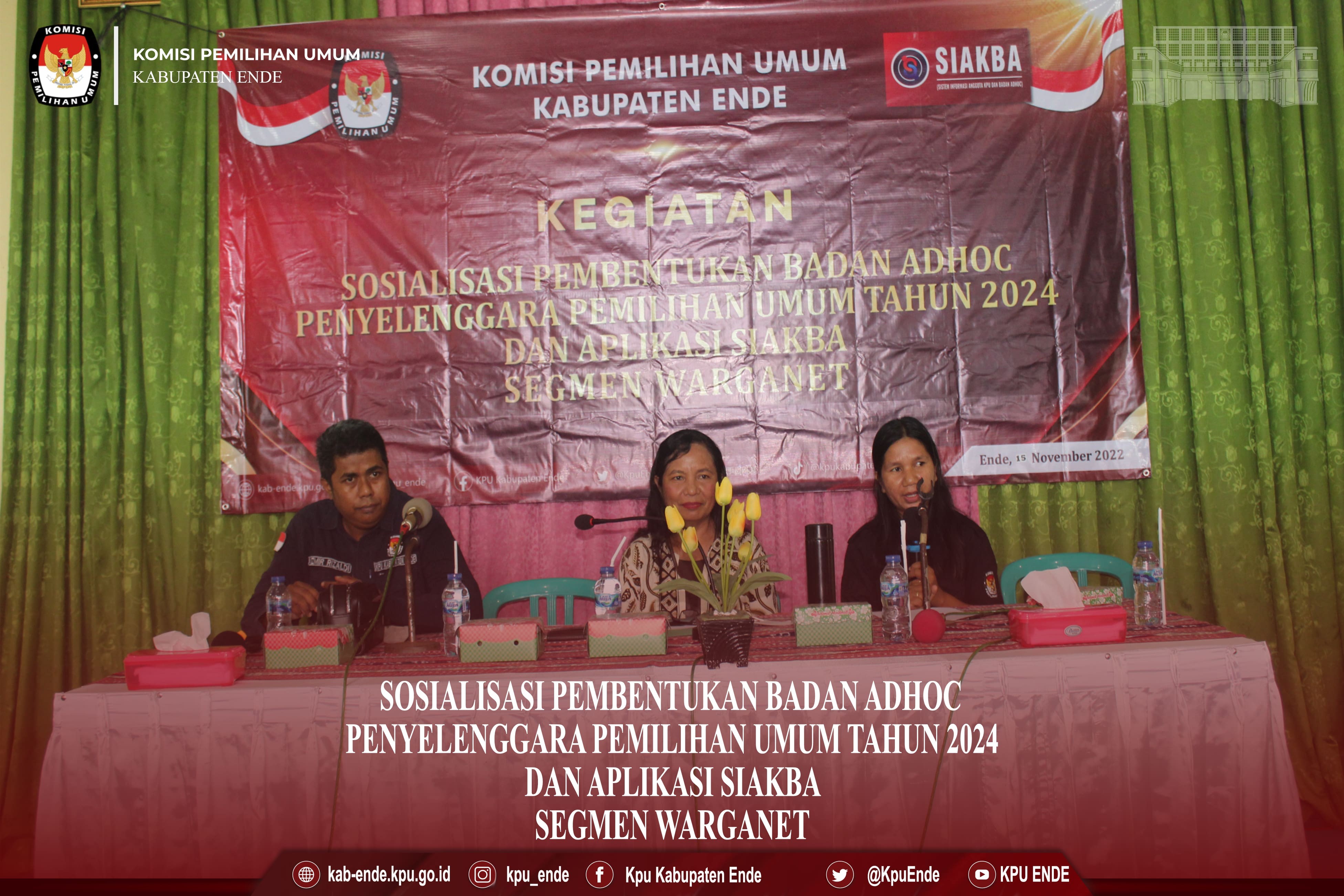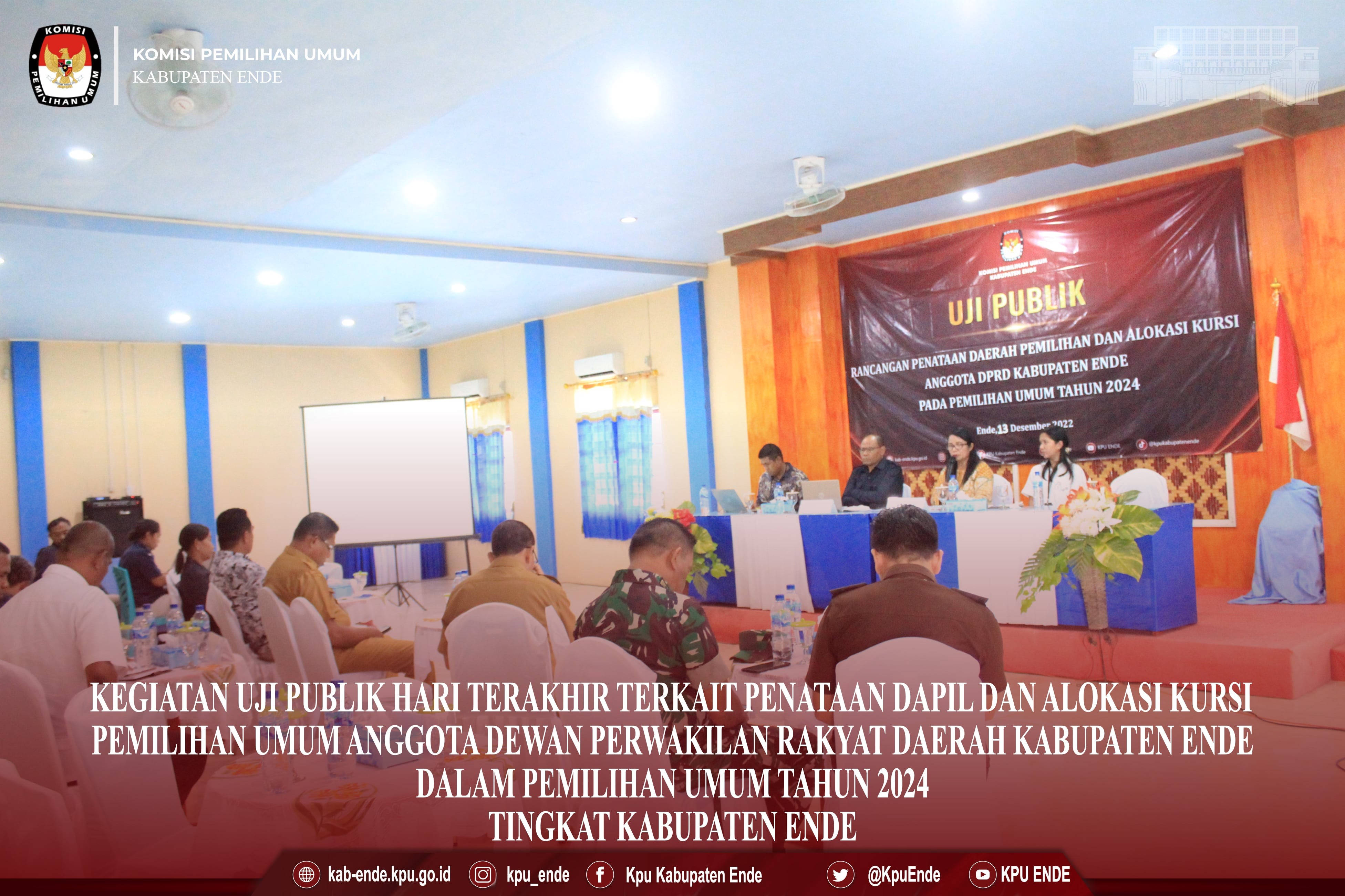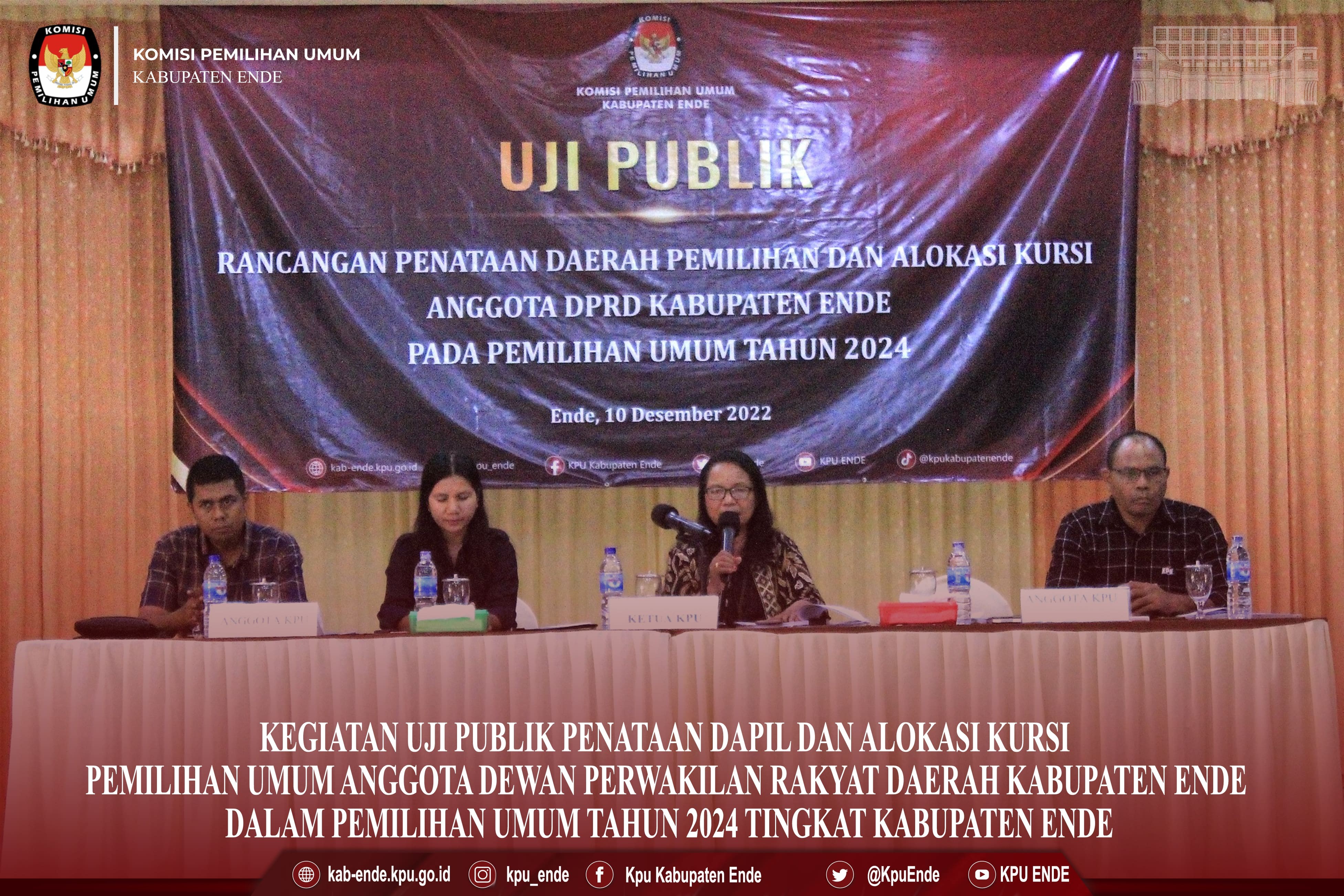 #TemanPemilih, KPU Kabupaten Ende melaksanakan kegiatan Uji Publik terkait Penataan Dapil dan Alokasi Kursi Pemilihan Umum Anggota Dewan Perwakilan Rakyat Daerah Kabupaten Ende dalam Pemilihan Umum Tahun 2024 tingkat Kabupaten Ende. Kegiatan ini dibuka oleh Ketua KPU Kabupaten Ende, Adolorata Maria Da Lopez Bi. Turut hadir dalam kegiatan tersebut, Anggota KPU Kabupaten Ende Ketua Divisi Teknis Penyelenggaraan Fransiskus Lothar Piara, Anggota KPU Kabupaten Ende Ketua Divisi Hukum dan Pengawasan Maria Rosita De'so dan Anggota KPU Kabupaten Ende Ketua Divisi Sosialisasi Pendidikan Pemilih, Partisipasi Masyarakat dan SDM Izmir Rizaldi. Kegiatan ini juga dihadiri oleh BAWASLU Kabupaten Ende dan Para Camat dalam Kota, Tokoh perempuan, Ketua Perhimpunan Penyandang Disabilitas dan tokoh masyarakat serta Lembaga swadaya masyarakat lainnya. Kegiatan juga dilanjutkan dengan Pemaparan materi sosialisasi tentang tata cara perekrutan Badan Adhoc PPK dan PPS Oleh Anggota KPU Kabupaten Ende Ketua Divisi Sosialisasi Pendidikan Pemilih, Partisipasi Masyarakat dan SDM Izmir Rizaldi dan dilakhiri dengan diskusi bersama terkait pemetaan TPS untuk persiapan Pemilu 2024 dan Foto bersama. kegiatan ini diselenggarakan oleh KPU Kabupaten Ende dari tanggal 10, 12, Desember 2022