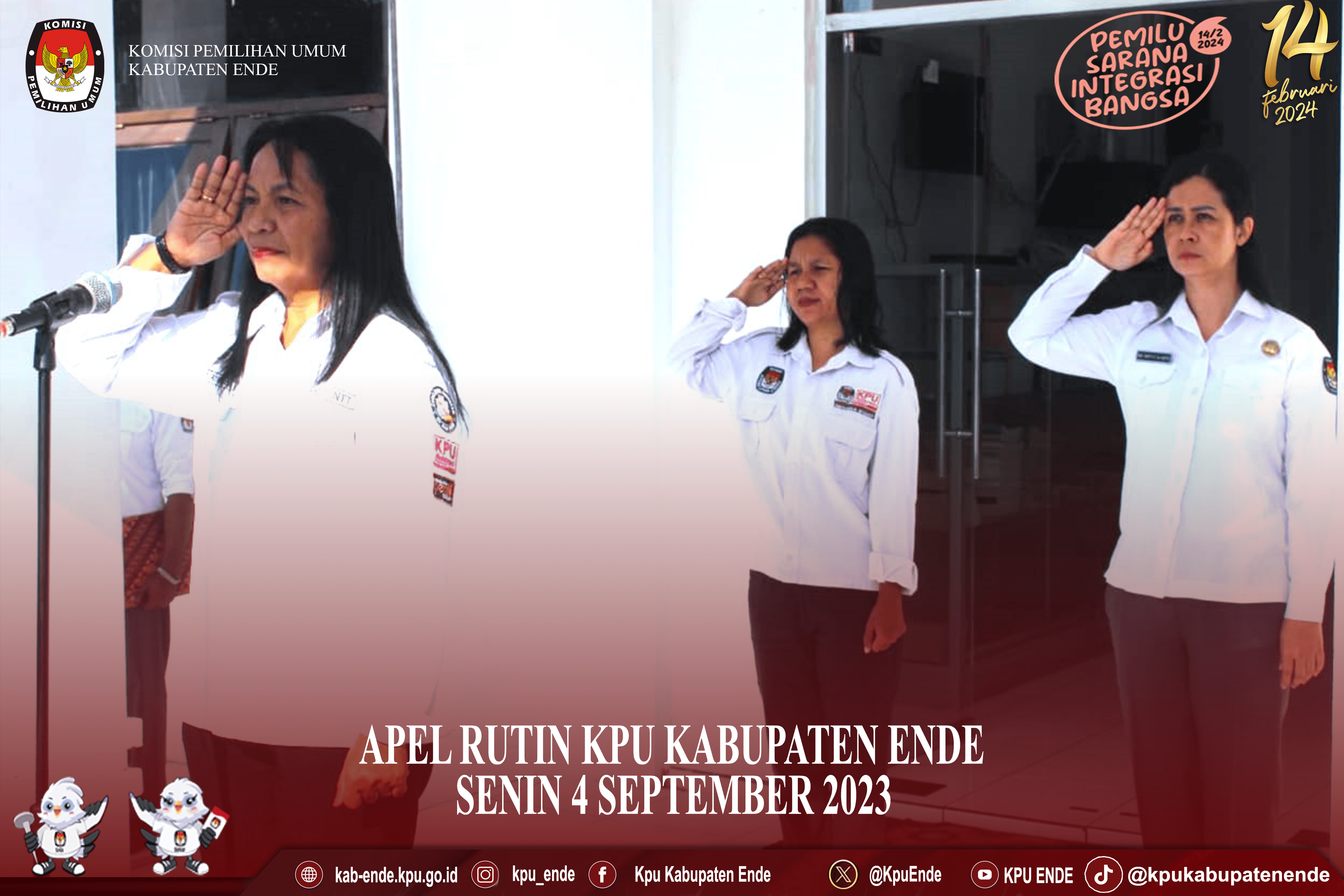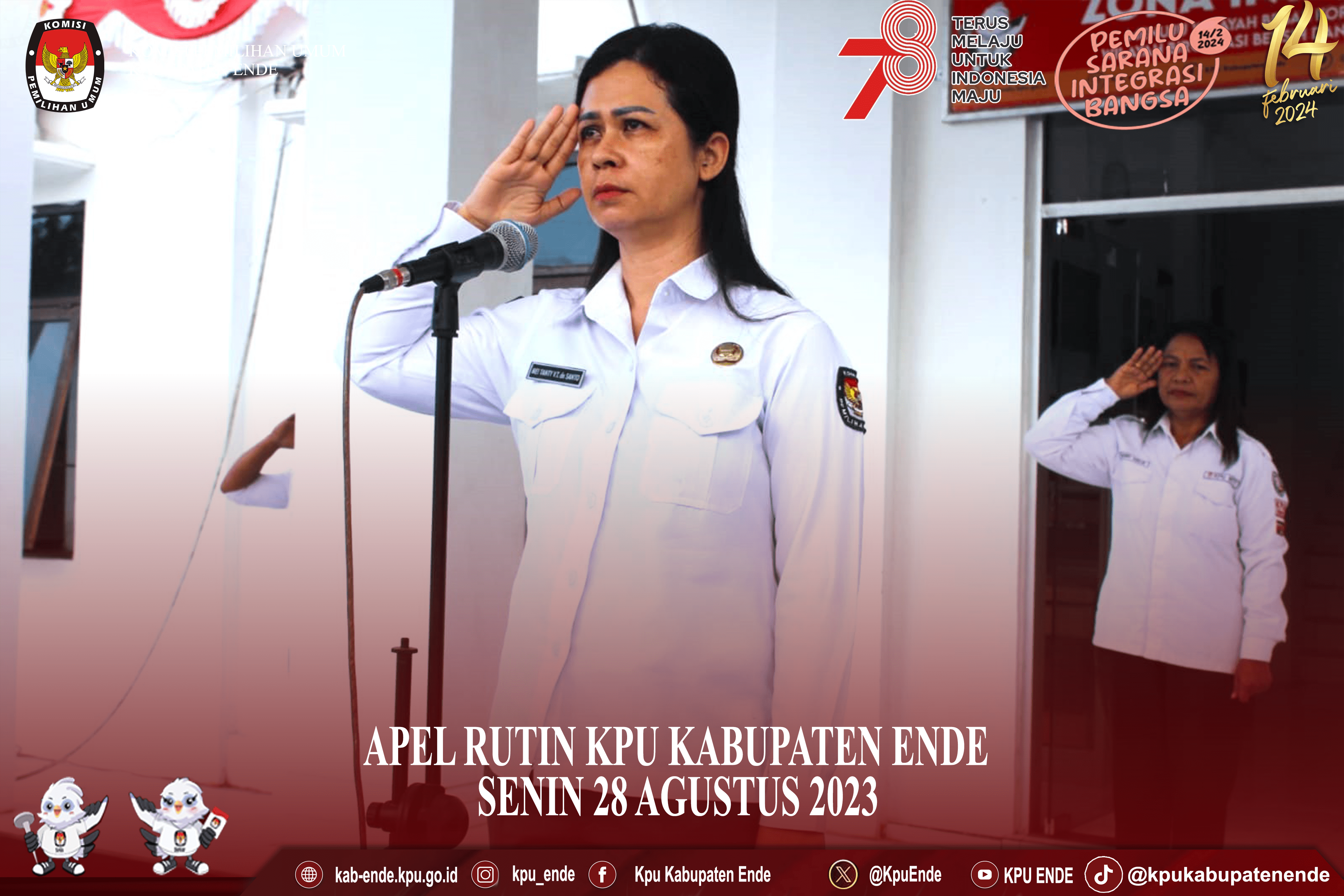 #TemanPemilih, Senin (28/08/2023) bertempat di halaman Kantor, KPU Kabupaten Ende melaksanakan apel rutin mingguan. Bertindak sebagai Pembina Upacara, Sekretaris Komisi Pemilihan Umum Kabupaten Ende Mei Tanty Viliawaty Tunggal De Santo dalam arahan pada pelaksanaan apel mingguan dimaksud menyampaikan terima kasih karena sudah menyelesaikan 6 tahapan pemilu dan juga mengingatkan bahwa tanggapan masyarakat terkait DCS berakhir hari ini, beliau juga menyampaikan agar tetap memperhatikan terkait laporan-laporan yang diminta oleh hirarki, persiapan pembuatan SKP dan mempersiapkan diri untuk mengikuti Ujian Kompetensi bagi pejabat eselon III, eselon IV dan pejabat dengan pangkat golongan III/c dan III/d dan juga persiapan untuk ujian menjadi pejabat pengadaan barang jasa di bulan september 2023. arahan terakhir dari upacara apel rutin minggu ini, Sekretaris KPU Ende mengingatkan untuk tetap menjaga kesehatan, jaga kekompakan, jaga kedisiplinan keluar masuk kantor dan kebersihan semua lingkungan kantor.