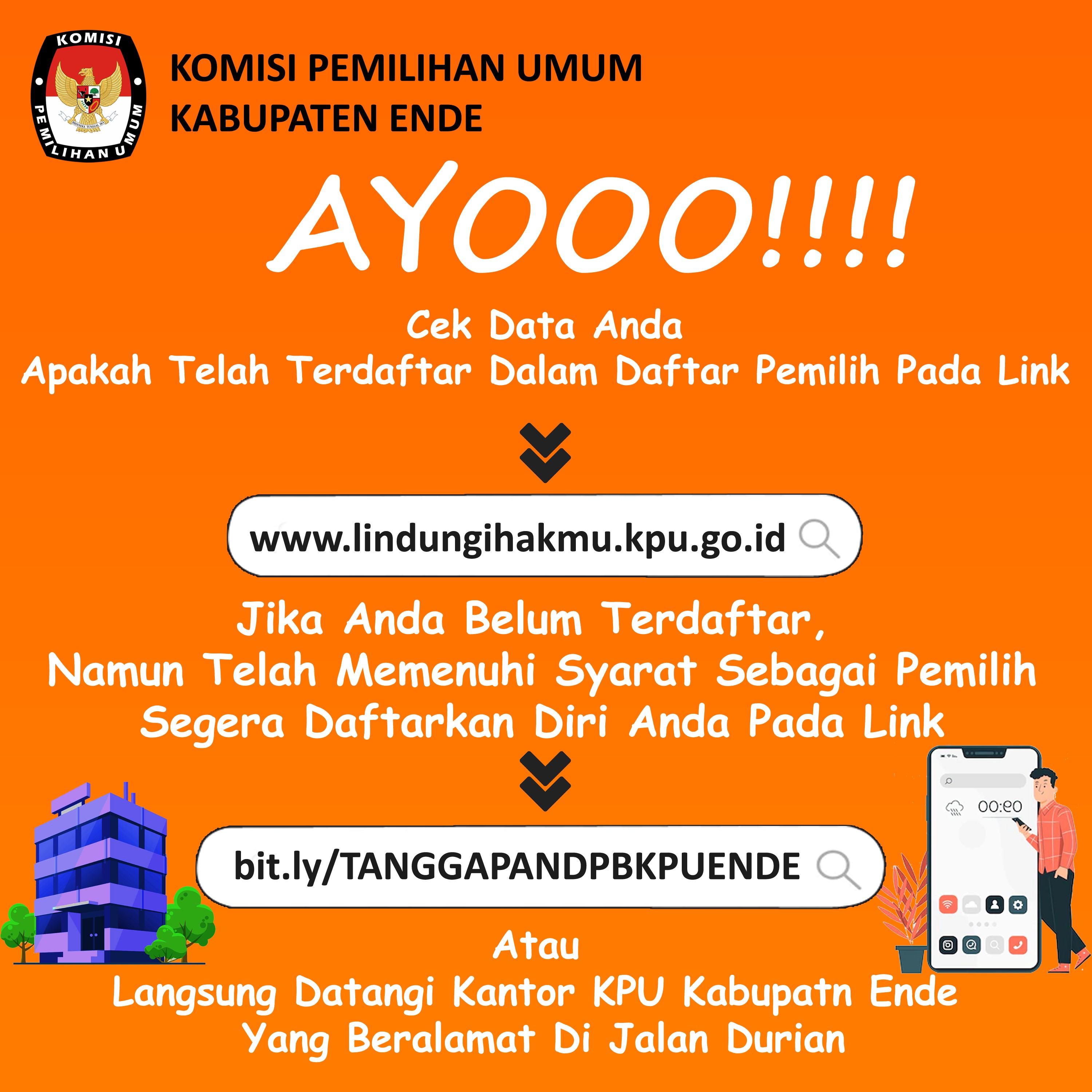 Silahkan Cek pada link www.lindungihakmu,kpu.go.id untuk pastikan Anda telah terdaftar dalam Daftar Pemilih, jika belum terdaftar, segera daftarkan diri Anda,, AYO...!!!! Gunakan Hak Pilihmu pada Pemilu/Pemilihan 2024 mendatang.